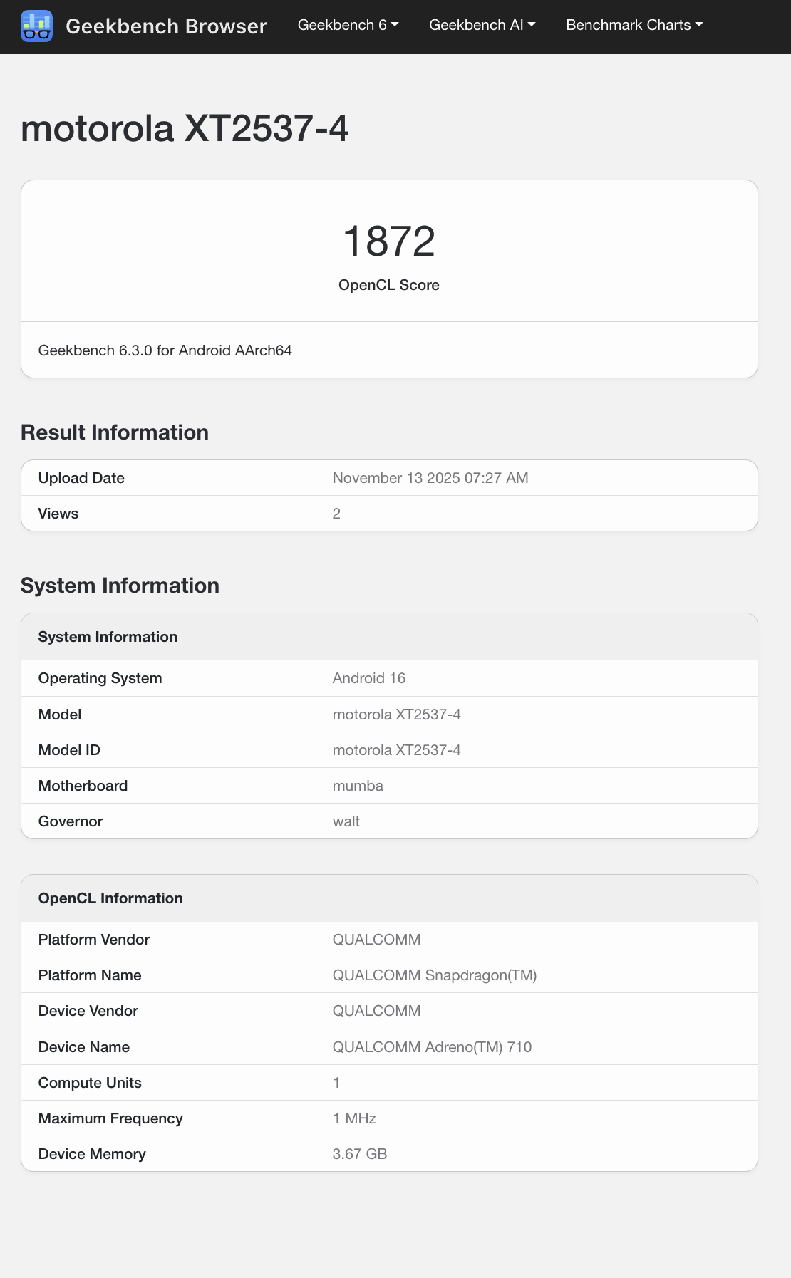 Ennek ellenére egy újabb új modell bukkant fel a Geekbench-en a hivatalos megjelenés előtt. A benchmarking platform jelenleg csak a "Motorola XT2537-4" nevet adja vissza, az XT2534-4 pedig az "XT2537" gyökérmodellszám egyik változata. Ezzel együtt több forrás is azt jelzi, hogy az XT2537 a Moto G76-ra vonatkozik, amely a Moto G76 közvetlen utódja Moto G75 amely tavaly októberben jelent meg Snapdragon 6 Gen 3 lapkakészlettel. Ezzel szemben úgy tűnik, hogy a Moto G76 a Snapdragon 6s Gen 4 chipsetet tartalmazza, amelyet a Qualcomm kevesebb mint egy hónapja mutatta be.