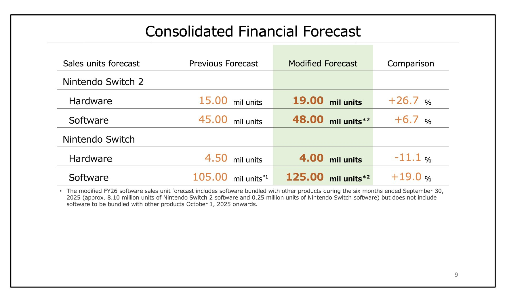 Ebben a szakaszban a Nintendo arra számít, hogy a Switch 2 népszerűbb lesz, mint a Switch az első évében is, amely 14,86 millió darabot ért el ebben az időszakban. Nem meglepő módon az utóbbi eladásai tovább csökkennek, a Nintendo 60%-os visszaesést regisztrált az előző évhez képest, 1,89 millió darabra. Ennek következtében a Nintendo 4 millió darabra csökkentette az örökölt modell hardveres előrejelzését, bár a szoftveres előrejelzéseket 105 millióról 125 millióra javította, valószínűleg a Switch 2 címekkel való visszafelé kompatibilitás és az, hogy a Mario Kart World már 9,57 millió darabot szállított le.