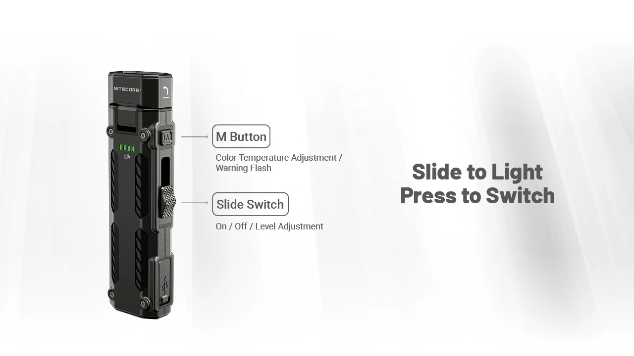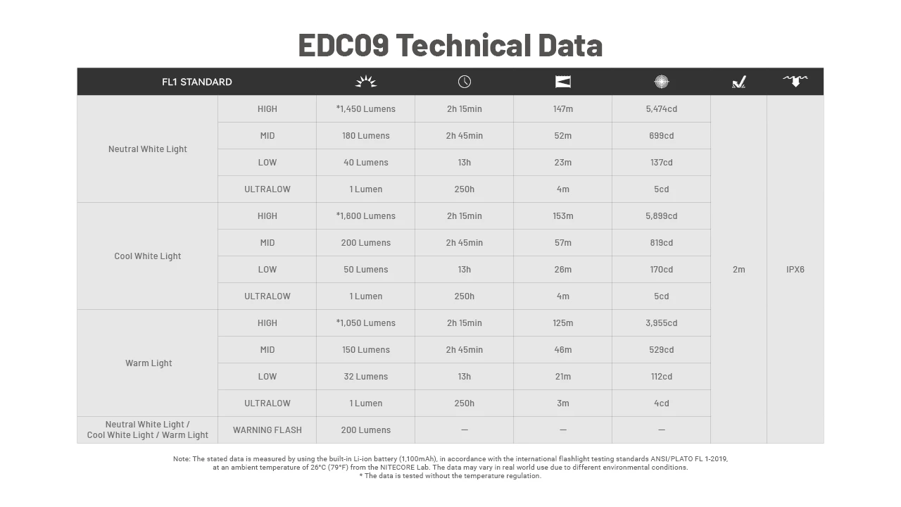 A zseblámpa IPX6 minősítésű, alig több mint 10 cm hosszú és 114 gramm súlyú, az akkumulátorral együtt. Az akkumulátor nem cserélhető, és USB-C-n keresztül töltődik, így a zseblámpa töltés közben is használható. Az akkumulátor élettartama 2 óra 15 perc a legfényesebb üzemmódban és 250 óra a leghalványabb üzemmódban, függetlenül a fény színétől. A hatótávolságot és a fényerőt azonban befolyásolja a fény színe. Az adatok a gyártó alábbi táblázatában találhatók.
