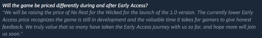 Mahler szerint a No Rest for the Wicked ára 40 dollárról 60 dollárra fog emelkedni, amint elhagyja az Early Access-t, mivel egy "prémium címről" van szó Az áremelést már korábban megerősítették, és a játék Steam-oldalán is egyértelműen szerepel.