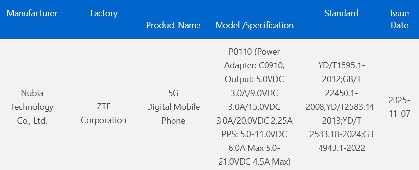 Az okostelefon nemrégiben kiadott 3C tanúsítványából kiderül, hogy a Nubia P0110 94,5-es töltővel érkezhet, vagyis a töltési részlegben is a csúcson van.