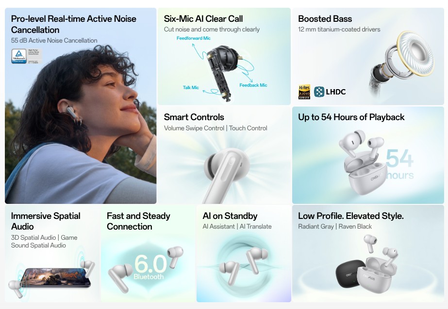 Mindegyik fülhallgató három mikrofonnal rendelkezik, és egy saját fejlesztésű AI algoritmussal dolgoznak, hogy felismerjék és csökkentsék a szél- és közlekedési zajokat hívás közben. A fülhallgatók másik újdonsága, hogy Hi-Res Audio tanúsítvánnyal rendelkeznek, és támogatják az LHDC 5.0-t. Emellett 3D térbeli hangzással és Game Sound térbeli hangzással is rendelkeznek.