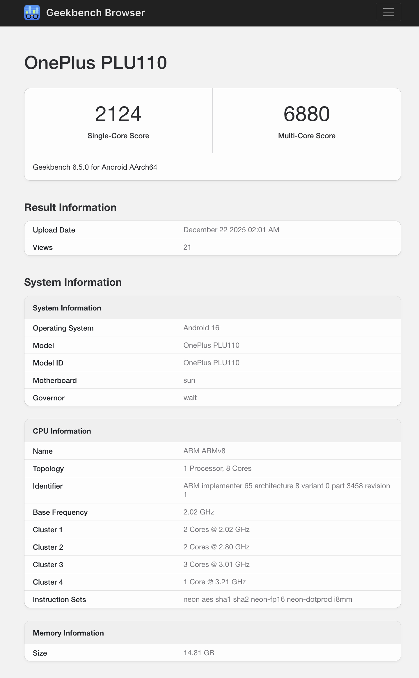 Bár a Geekbench nem erősíti meg a készülék kereskedelmi nevét, a PLU110 vélhetően a be nem jelentett OnePlus Turbo lehet. Mindkét listázás szerint a OnePlus Turbo 16 GB RAM-mal és a Qualcomm legújabb Snapdragon 8s Gen 4 lapkakészletet. Az egész Semmi telefon (3) és a oldalon Poco F7 (jelenleg 529,99 $ az Amazonon), a Snapdragon 8s Gen 4 egyetlen, 3,2 GHz-es órajelű ARM Cortex-X4 chipsetet használ.