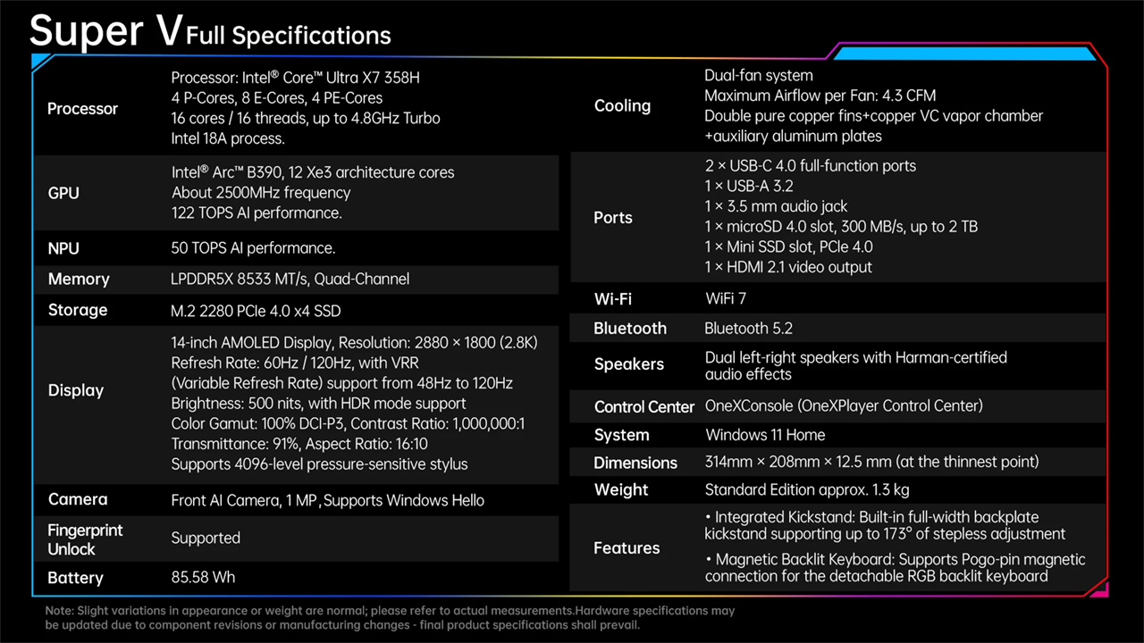 Ez a 48 GB LPDDR5X RAM-mal és 1 TB PCIe 4.0 SSD-vel ellátott Intel játékkéziszámítógép jelenleg a 1 899 dollárért kapható a hivatalos áruházban. Az Asus ezzel szemben a ROG Flow Z13 32 GB RAM-mal 2 299,99 dollárért kínálja (jelenleg 2 069,99 dollár az Amazonon). Az érdeklődők számára a OneXPlayer Super V teljes adatlapját alább csatoljuk.