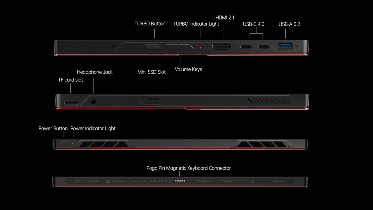 A portkonfiguráció is megegyezik a OneXPlayer Super X-ével, a Super V a következő portokkal érkezik: