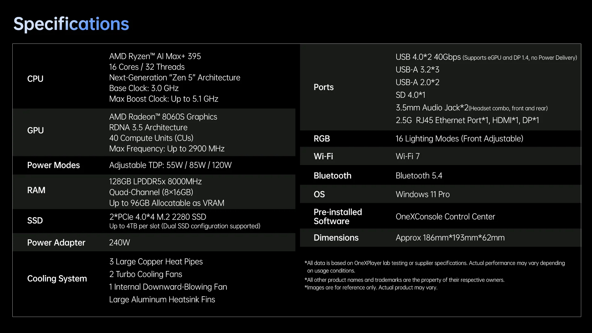 A tárolási oldalon a OneXStation két PCIe 4.0 x4-es bővítőhellyel rendelkezik, amelyek mindegyike legfeljebb 4 TB-os SSD-t támogat (2 TB-os Samsung 990 EVO Plus jelenleg 375,73 $ az Amazonon). A OneXPlayer továbbá kiemeli, hogy a mini PC kettős ventilátoros hűtőrendszerrel rendelkezik, egy belső, lefelé fújó ventilátorral. Ez a beállítás lehetővé teszi, hogy a rendszer akár 120 W teljesítményt is nyújtson.