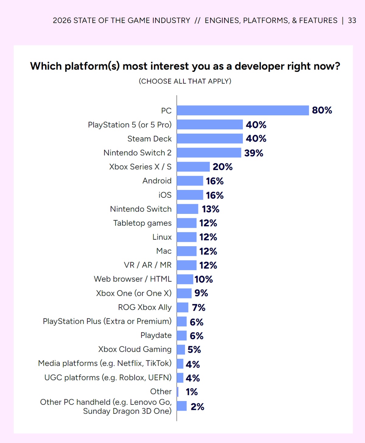 A 2025-ös jelentéshez hasonlóan az asztali és a laptopos játékok továbbra is első számú prioritást élveznek az alkotók számára. Egyetlen konzol sem rendelkezik ugyanolyan masszív felhasználói bázissal, és az olyan népszerű piacterek, mint a Steam kevesebb korlátozással rendelkeznek. Ez a támogatás még a Linux-alapú Steam Deckre is kiterjed, amely lenyűgöző 40%-ot ért el.