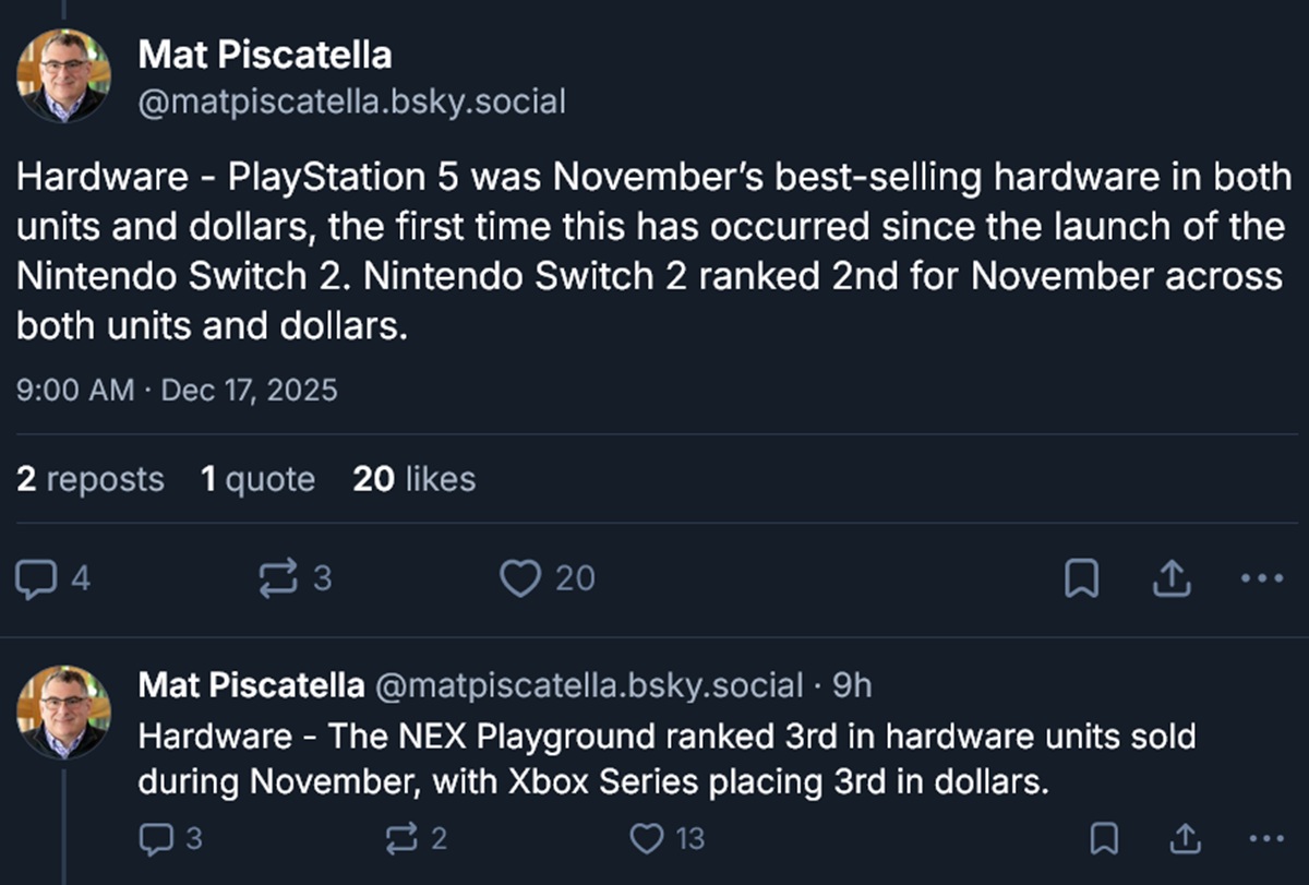 A A Switch 2 sikeres volt a Nintendo számára, mivel a kiskereskedelmi teljesítménye felülmúlta a várakozásokat. A Sony játékrendszerei mégis ellenállónak bizonyulnak, miután a PS5 eladásai a Circana listájának élére kerültek novemberben. Az amerikai adatok szerint a PlayStation-konzol a kézikonzolos rivális megjelenése óta először végzett az első helyen.