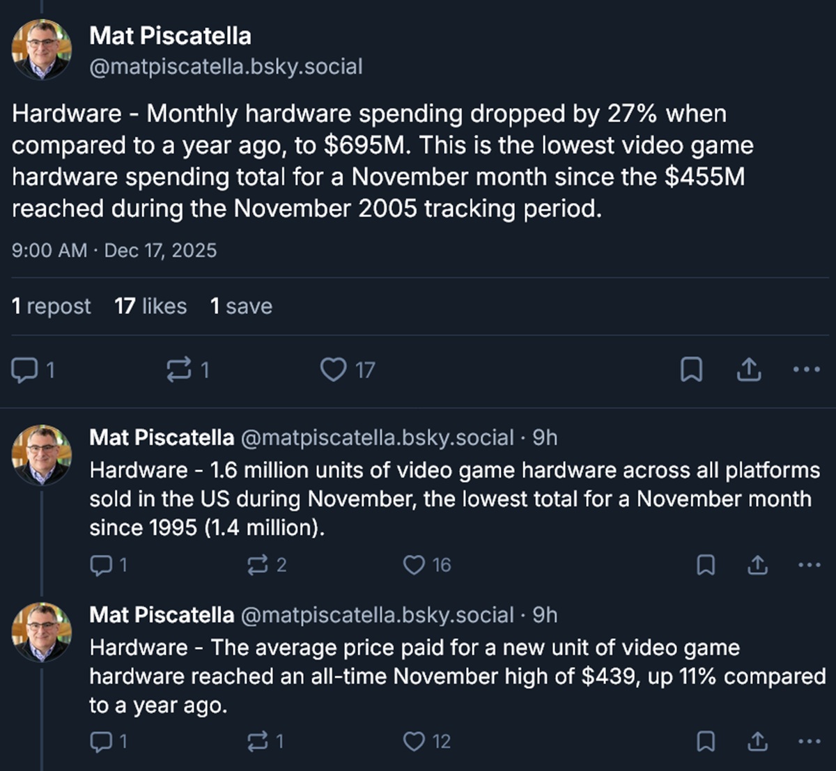 A számok kontextusba helyezéséhez a Circana munkatársa, Mat Piscatella elméleteket kínált a PS5 diadaláról. Figyelmezteti a játékosokat, hogy ne reagálják túl a Switch 2 alacsonyabb eladásait. Az elemző megjegyzi, hogy a kézi konzol továbbra is a leggyorsabban fogyó konzol a nyomon követés kezdete óta. Ennek ellenére azt sugallja, hogy a a bőséges induló kínálat kannibalizálhatta a későbbi, 2025-ös potenciális vásárlásokat.