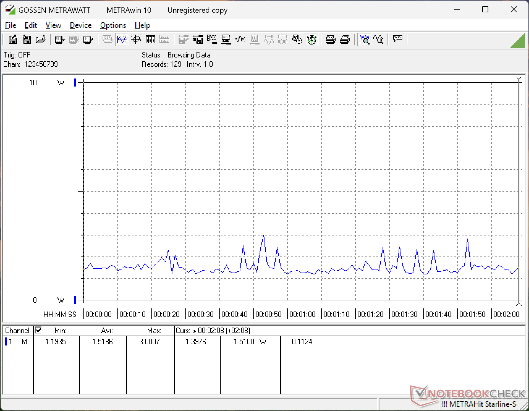 Az alábbi grafikon az XPS 16 FHD+ konfiguráció energiafogyasztását mutatja két perc alatt, amikor a legalacsonyabb fényerő beállítás mellett és a VRR engedélyezésével az asztali gép üresjáratban üzemel. A rendszer átlagosan mindössze 1,5 W-ot fogyaszt, ami egy nagy, 16 hüvelykes képernyőmérethez képest nagyon lenyűgöző. A konkurens modellek, mint például a Asus ZenBook S16 vagy a MSI Prestige 16 hasonló körülmények között 3 és 5 W között fogyasztanak.
