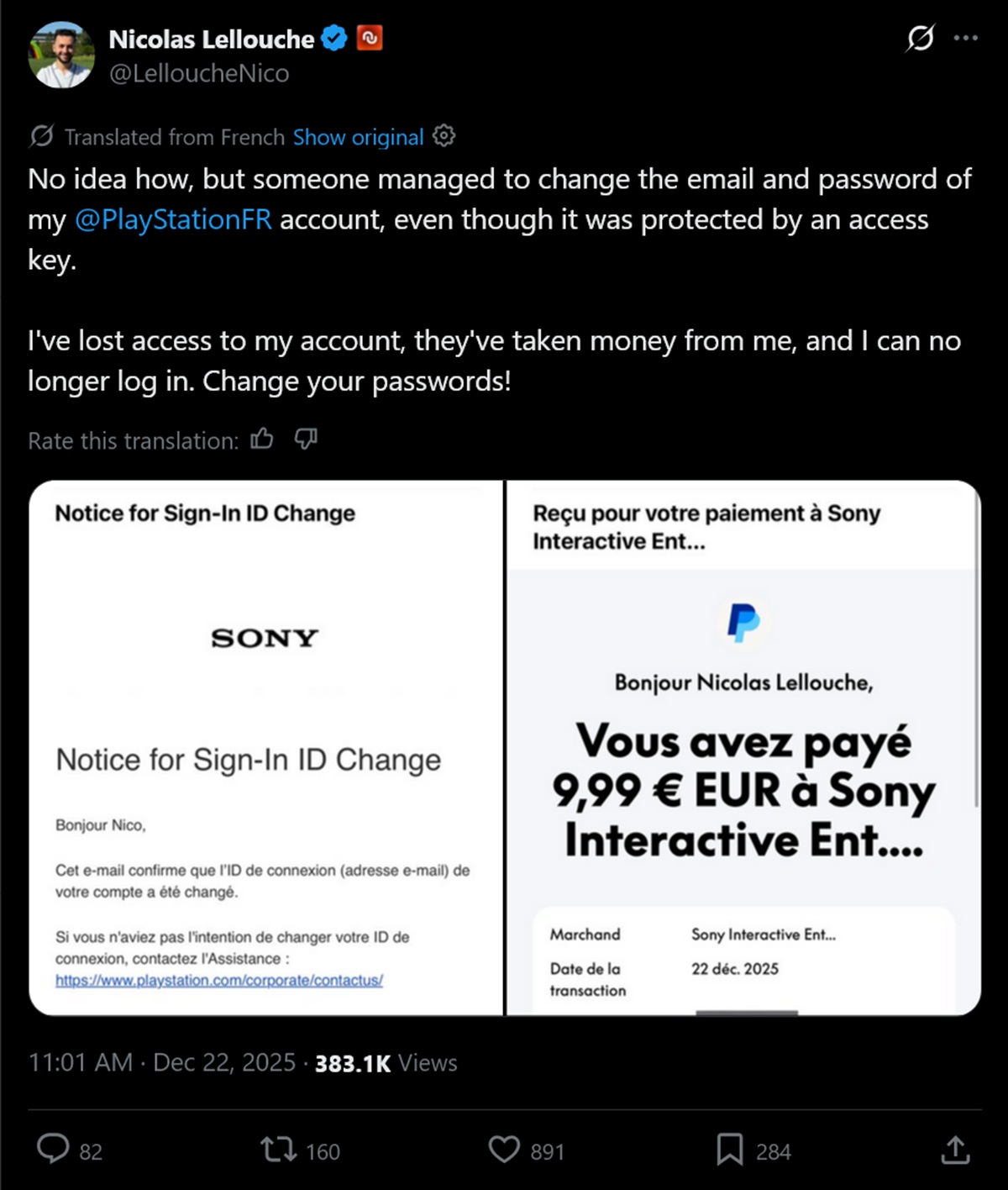 A Numerama írója, Nicolas Lellouche, a közösségi médiában dokumentálta küzdelmeit. Először azt részletezte, hogyan kompromittálta egy hacker az ő PSN-fiókját és kicserélte a hozzá tartozó e-mailt és jelszót. Lellouche egy 9,99 eurós díjat is észrevett, ami a módosítások díja.