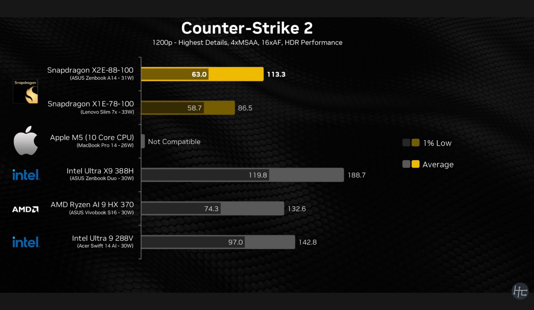 Ugyanezt a mintát figyelhetjük meg a Counter-Strike 2 esetében is, ahol a Snapdragon X2 Elite átlagosan több mint 113 FPS-t produkál, de az 1% Lows 63 FPS-nél marad. Hasonlítsuk ezt össze a Core Ultra X9 388H 188,7 FPS-es átlagával és 119,8 FPS-es 1%-os Lows-ával, és a probléma teljesen egyértelművé válik.