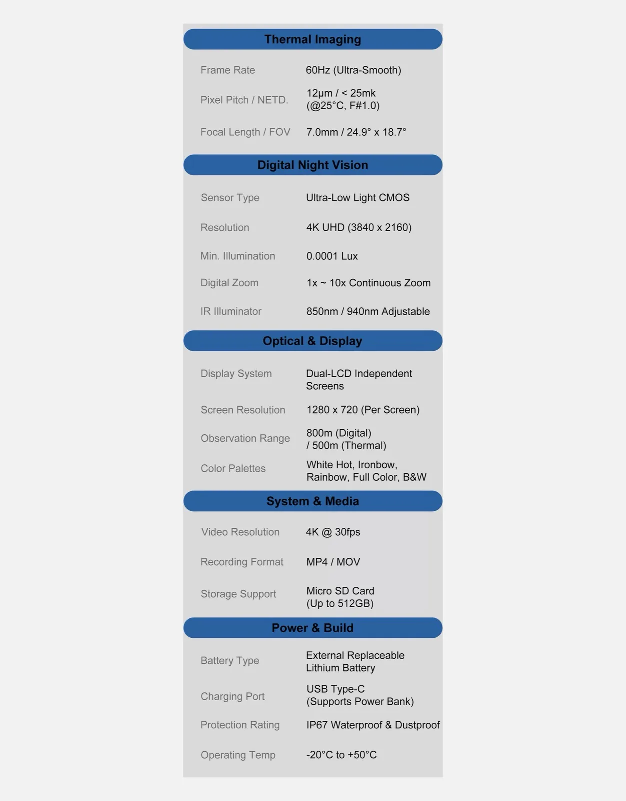 A gyártó tízszeres zoomot hirdet, de az információk hiánya miatt feltételezhető, hogy ez digitális zoom, ami negatívan hat a képminőségre. A SpectraEyes rendelkezik egy olyan hőkamerával is, amely másodpercenként 60 képet képes rögzíteni, bár ennek a kamerának a felbontása nincs megadva. Az akkumulátor állítólag négy-öt óra üzemidőt biztosít az éjjellátó kamera használatakor, illetve két órát mindkét kamera használatakor. Két, egyenként 1280 x 720 pixel felbontású kijelzőn egyszerre jeleníti meg a két kamera videóit