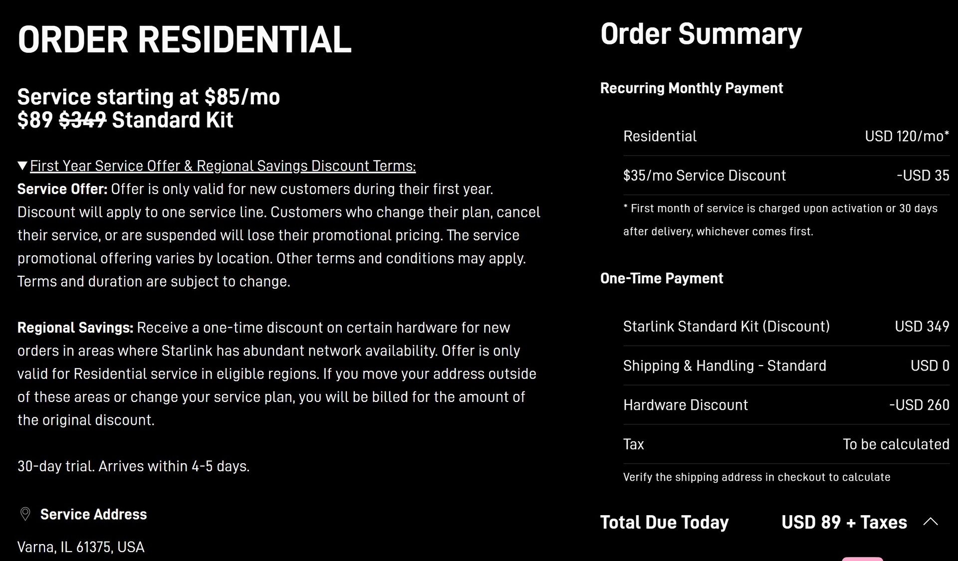 Az ajánló linkkel történő regisztrációt követően az ajánló Starlink-ügyfél az új fiók aktiválását követő 30 napon belül e-mailben visszaigazolást és ingyenes szolgáltatási jóváírást kap, amely a következő számlázási időszakra érvényes. Az Egyesült Államok bizonyos alulszolgáltatott régióiban, ahol a Starlink a weboldalon fut tányér- és szolgáltatáskedvezményes promóciót hirdet, műholdas internetszolgáltatása már 89 $-os kezdőrészlettel is elindítható, amint az alább látható.