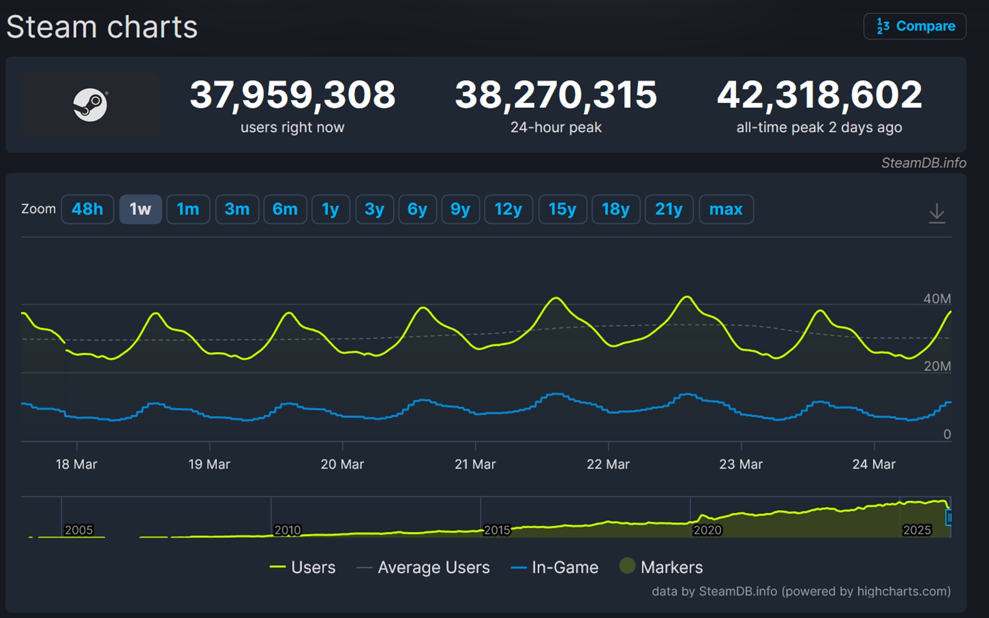 Míg a a Steam játékok játékosainak száma kapják a legnagyobb figyelmet, Steam Charts és SteamDB más mérőszámokat is mérnek. Az egyidejű felhasználószámlálás megmutatja, hogy hány játékos van bejelentkezve a Valve kliensébe, még akkor is, amikor nem merül el a játékban. Lehet, hogy az áruházban böngésznek vagy a közösségi funkciókat amelyek a rajongókat az ökoszisztémában tartják.