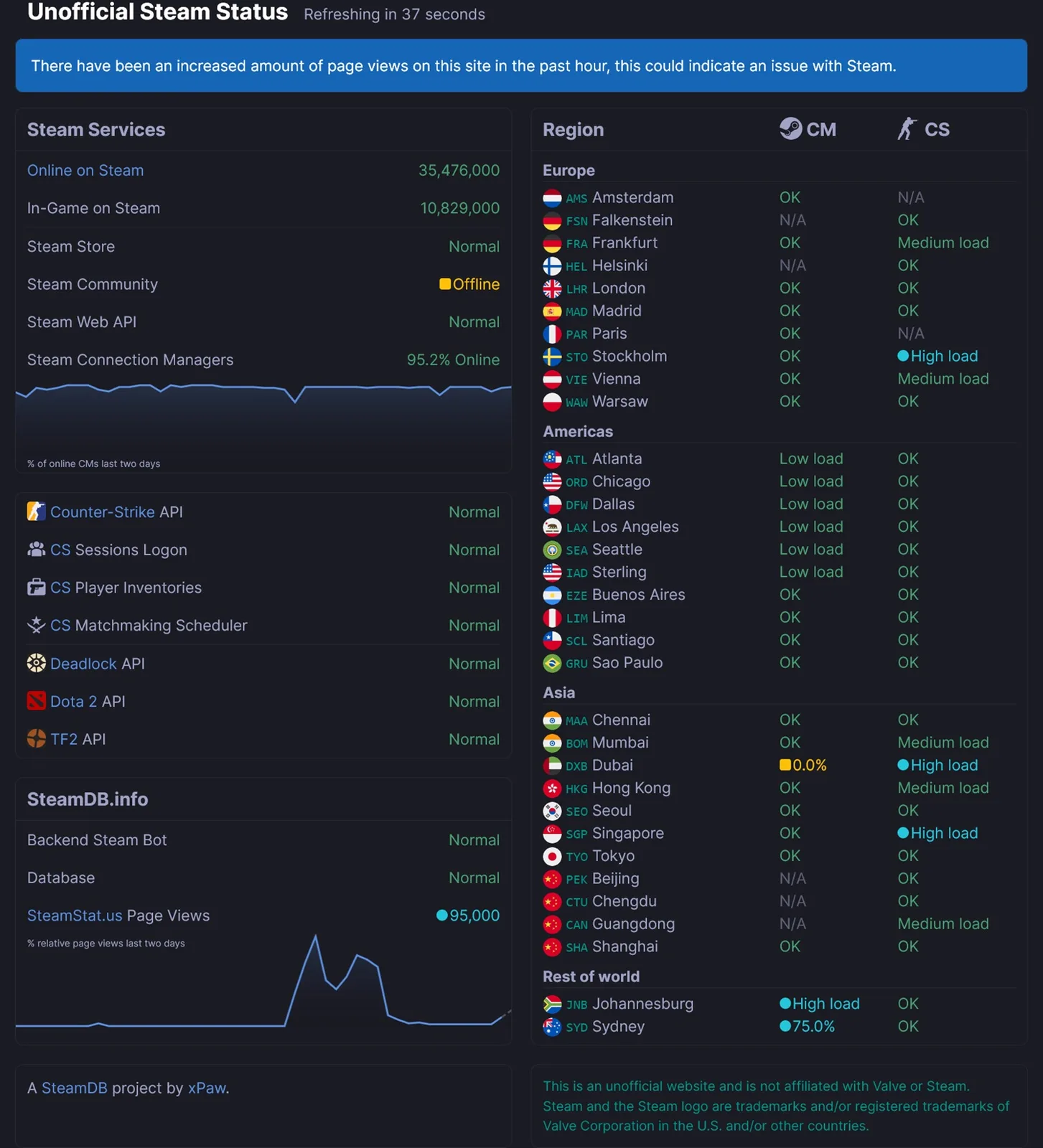 Nem sokkal azután, hogy a kálvária kezdődött december 24-én, Downdetector 13,850 jelentéssel tetőzött. 12 órával később a szerverproblémák megoldódni látszottak. A Steam leállásáról szóló panaszok száma azonban ismét emelkedik, a játékosok pedig nem tudnak hozzáférni a fórumokon a játéktippekhez. Egyes esetekben a játékosok hibákat látnak a mobileszközökön történő bejelentkezéskor.