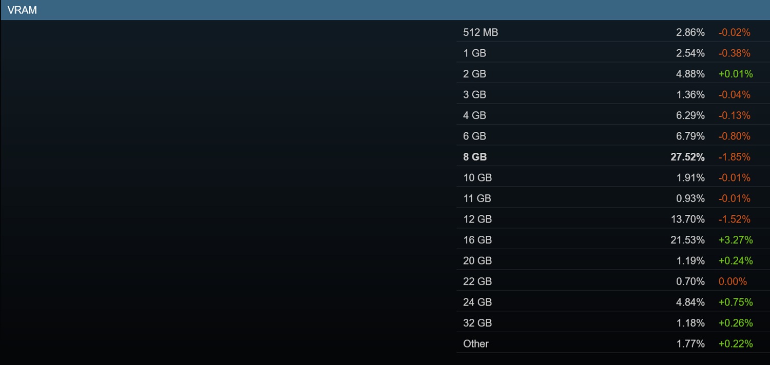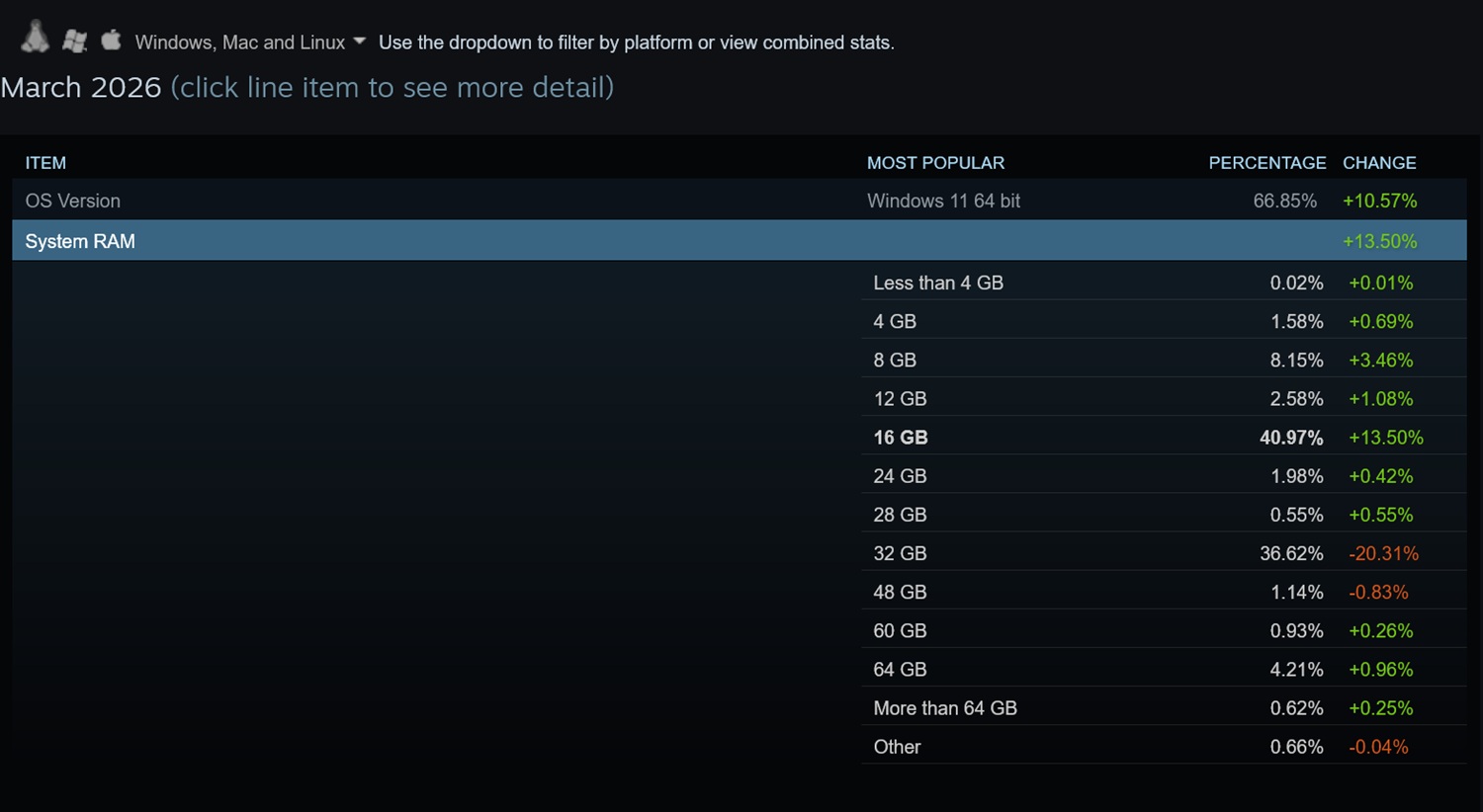 A Valve minden hónapban nyilvánosságra hozza a legnépszerűbb hardverkonfigurációkat a megdöbbentő számú játékosok körében. Az egyik nyilvánvaló változás a System RAM kategóriában található. a 32 GB-os kapacitásoknál figyelemre méltó, 20,31%-os csökkenés tapasztalható az előző jelentéshez képest. Eközben a 16 GB-os modulokkal rendelkező PC-k 13,50%-os népszerűségnövekedést tapasztaltak.
