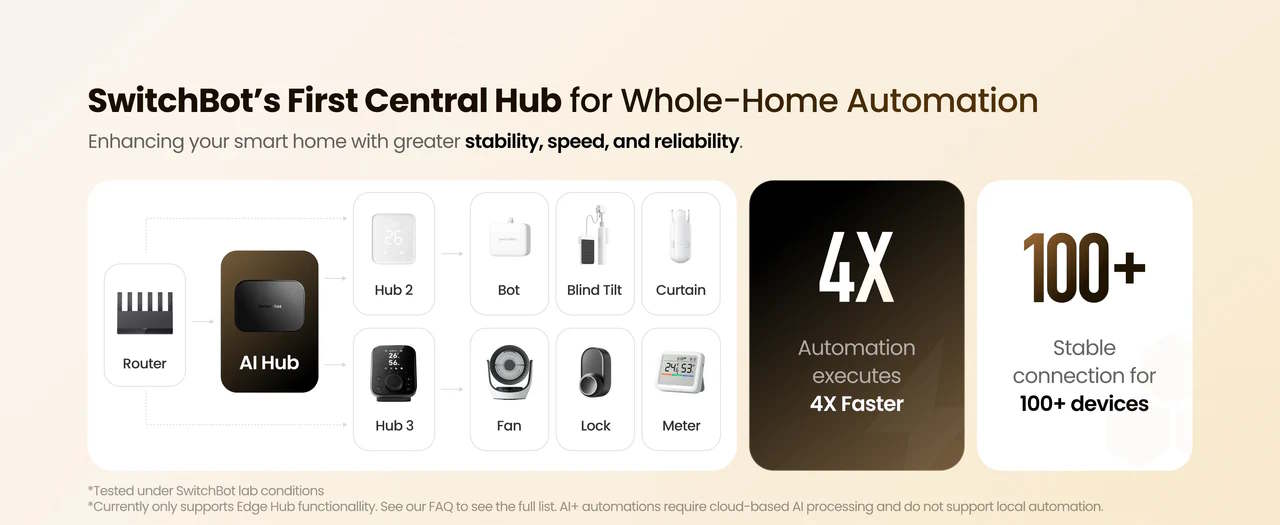 A SwitchBot szerint különböző AI funkciókat tartalmaz, többek között arc-, háziállat- és tárgyfelismerést az élő kameraképek esetében. A helyi VLM automatizációk is támogatottak, és lehetővé teszik egy aktuátor vezérlését egy felismert tárgytól függően. A SwitchBot példaként említi a lámpa bekapcsolását, ha egy személy fekszik a kanapén. Különböző viselkedések felismerhetők és intelligens rutinokat indíthatnak el. Az intelligens otthoni hubot 6 TOPS AI-teljesítménnyel hirdetik.