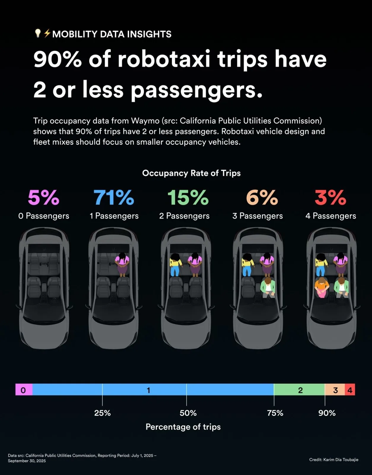 A kétüléses koncepciót most a Waymo kihasználtságáról szóló legfrissebb statisztikák igazolták. Kiderült, hogy a robottaxival megtett sofőr nélküli utak 90%-át egy vagy két emberrel teszik meg. Ezek túlnyomó többsége is csak egy emberrel utazik, és csak 9%-ban ül legalább egy ember az első üléseken.