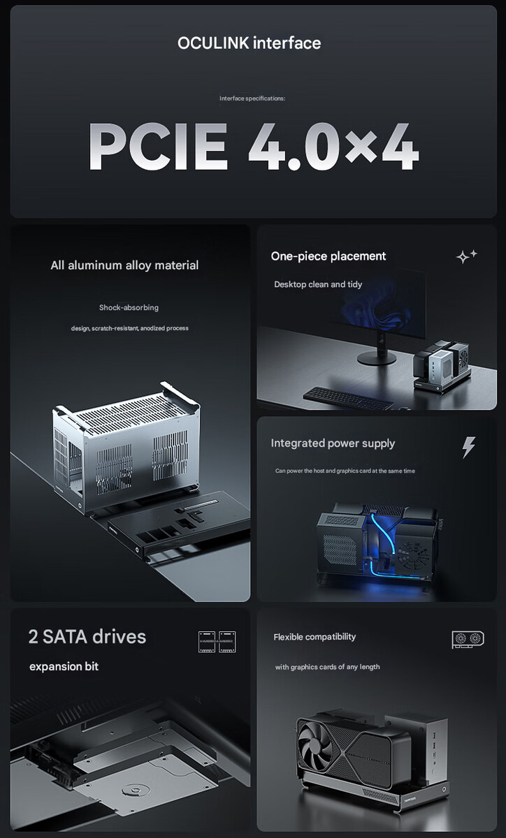 A Topfeel két új eGPU dokkolót mutatott be Kínában, a G1 és a G1 Pro modelleket. A kettő közül a G1 nyitott kialakítású, így nagyjából az összes asztali GPU-val kompatibilis. A dokkoló nyitott jellege lehetővé teszi ATX tápegység befogadását is, de a vállalat SFX tápegységet ajánl a karcsúbb megjelenés érdekében.