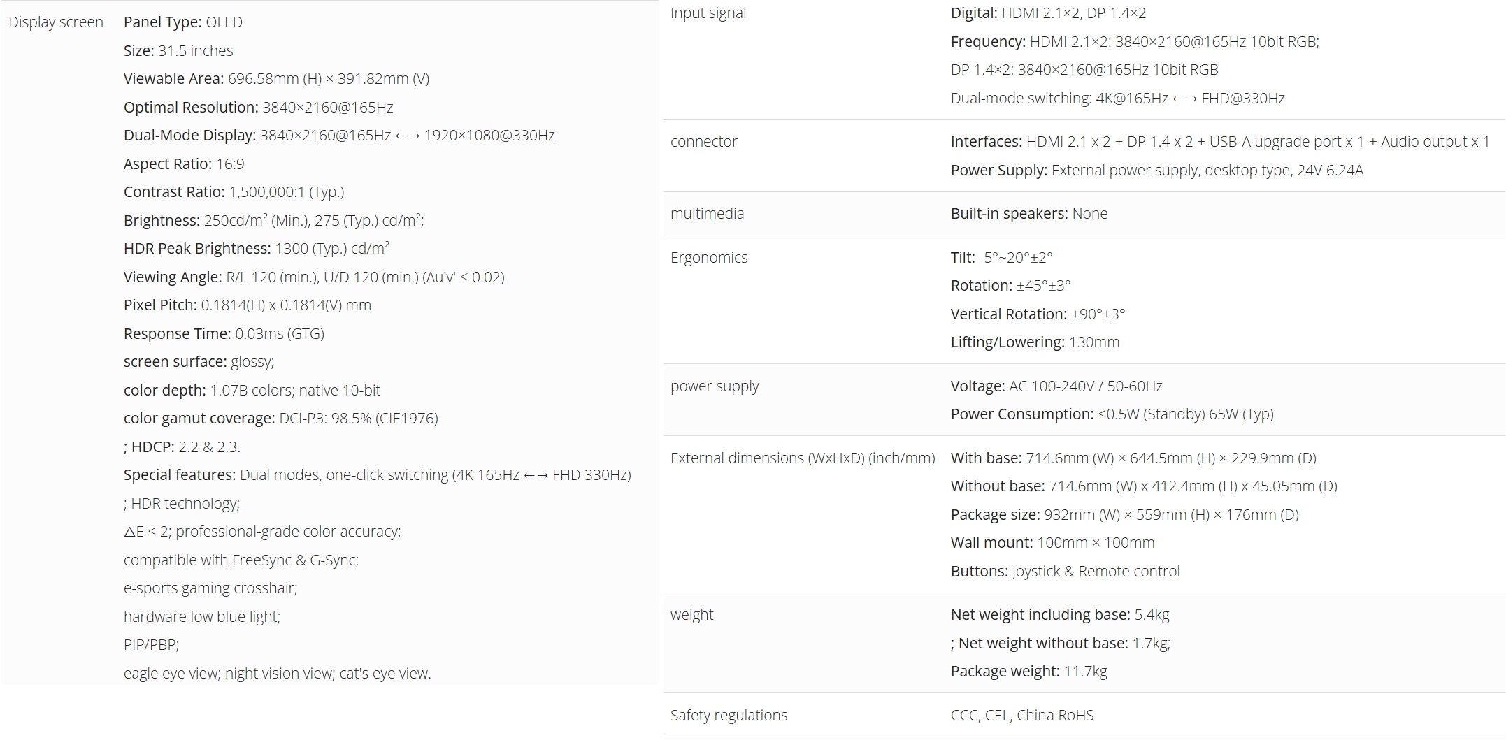 Míg az újabb játékmonitor megtartja a kettős üzemmóddal rendelkező OLED-panelt, addig 1080p felbontású üzemmódban 330 Hz-es, 4K felbontásban pedig 165 Hz-es frissítési frekvenciát tud nyújtani. Összehasonlításképpen, az XG323-4K-OLED2 amely tavaly mutatkozott be, FHD módban 480 Hz-re, 4K-ban pedig 240 Hz-re képes.