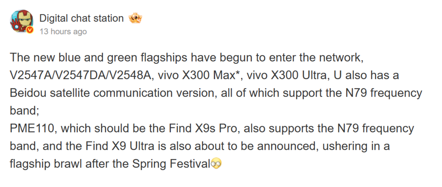 Jelenleg a kiszivárogtató még nem szolgáltatott bizonyítékot arra, hogy ez megtörtént volna. A V2548A modellszámnak azonban a következő egy hónapon belül különálló szivárgásokban kellene felbukkannia, ha az X300 Max létezik. Az alábbi Weibo-bejegyzés alapján úgy tűnik, hogy a Vivo a következő hónapban mutathatja be az X300 Max-ot a következő modell mellett X300 Ultra mellett (V2547A) MELLETT.