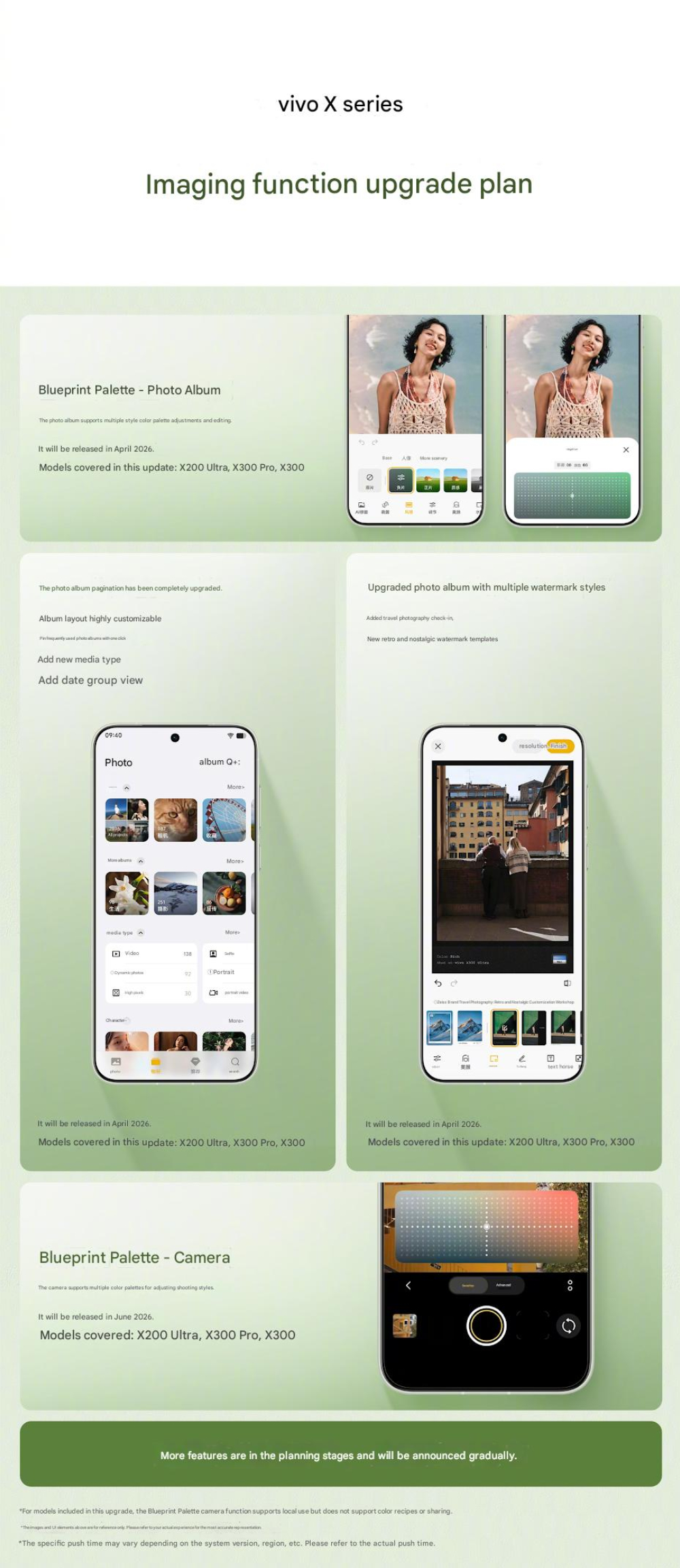 Ezenkívül ugyanez az alkalmazás a frissítés után bővített vízjelzési lehetőségeket tartalmaz majd, beleértve az új "nosztalgikus" és "retro" sablonokat. Jelenleg a Vivo ezeket az új funkciókat csak a X300, X300 Pro és a X200 Ultra. A Vivo azonban azt tervezi, hogy még ebben az évben több modellre is kiterjeszti az elérhetőséget.