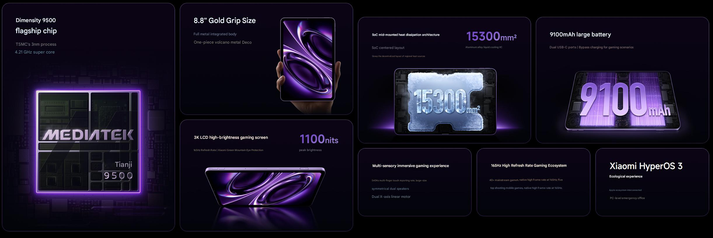 A motorháztető alatt a Redmi K Pad 2 a MediaTek jelenlegi generációs zászlóshajó SoC-jét, a Dimensity 9500-at tartalmazza. Azonban ellentétben a Redmi K90 Max telefonhoz képest, a Xiaomi nem párosította a dedikált D2 grafikus chippel, de azt állítja, hogy a játékteljesítmény több címen keresztül is szilárd marad.