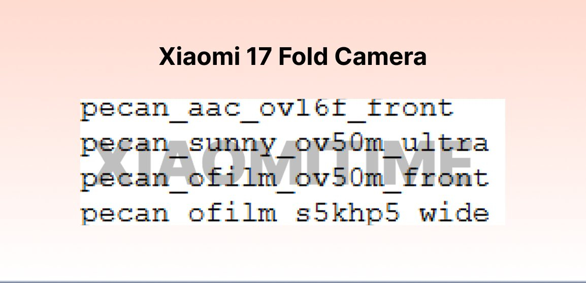 A szerint a XiaomiTime, a HyperOS kód tartalmaz utalásokat a "pecan" kamerahardverre, a Xiaomi 17 Fold állítólagos kódnevére. Amint az alábbi képen látható, a pecan az S5KHP5 széles vagy elsődleges kamerával rendelkezik. A Samsung ISOCELL HP5 rövidítése, az S5KHP5 200 MP-es natív kimenettel rendelkezik, és a tervek szerint az eszközökben fogják használni mint például a Find X9 Pro teleobjektív kameraként.