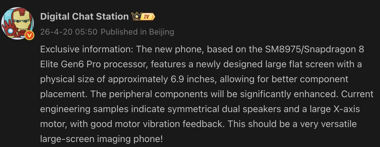 A tippadó nem árulta el a készülék pontos nevét, bár a kommentszekcióban néhány felhasználó azt találgatja, hogy ez lehet a Xiaomi 18 Pro Max. A szivárgás szerint a készülék a következő tulajdonságokkal fog rendelkezni Snapdragon 8 Elite Gen 6 Pro lapkakészlettel.