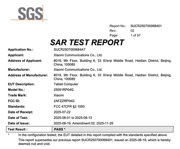 A táblagép a "25091RP04G" típusszámot kapta Összehasonlításképpen a kínai modell a Xiaomi Pad 8 Pro szinte azonos modellszámot használ, "25091RP04C", ahol a "C" a kínai modellt jelöli, míg a "G" a globális változatot.