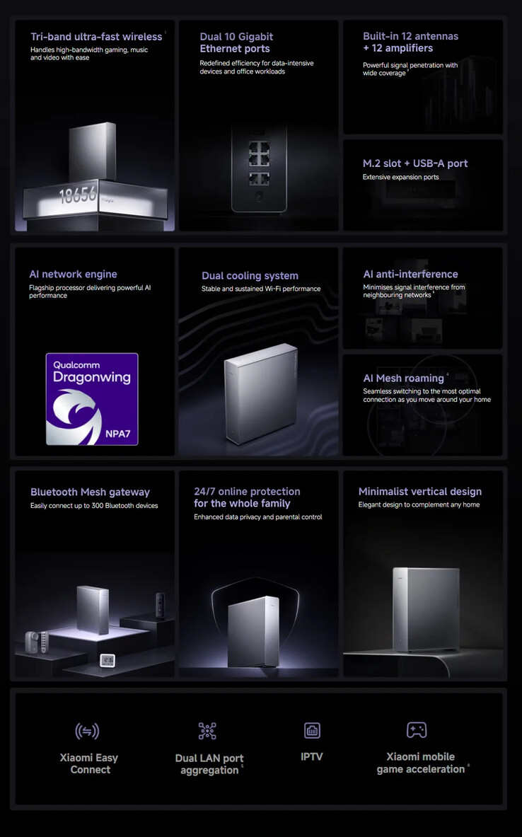 A Xiaomi új routerének méretei 242 x 70 x 273 mm. Ezért a BE19000 Pro router keskenyebb, de sokkal mélyebb, mint a konkurens Wi-Fi 7 routerek, például a Netgear Orbi 970 sorozat (jelenleg 799 dollár az Amazonon). Ennek ellenére a Router BE19000 Pro kettős 10 Gigabites Ethernet-et tartalmaz, és a beépített M.2 2280-as és USB 3.0 csatlakozási lehetőségnek köszönhetően még saját hálózati tárolóként (NAS) is szolgál.