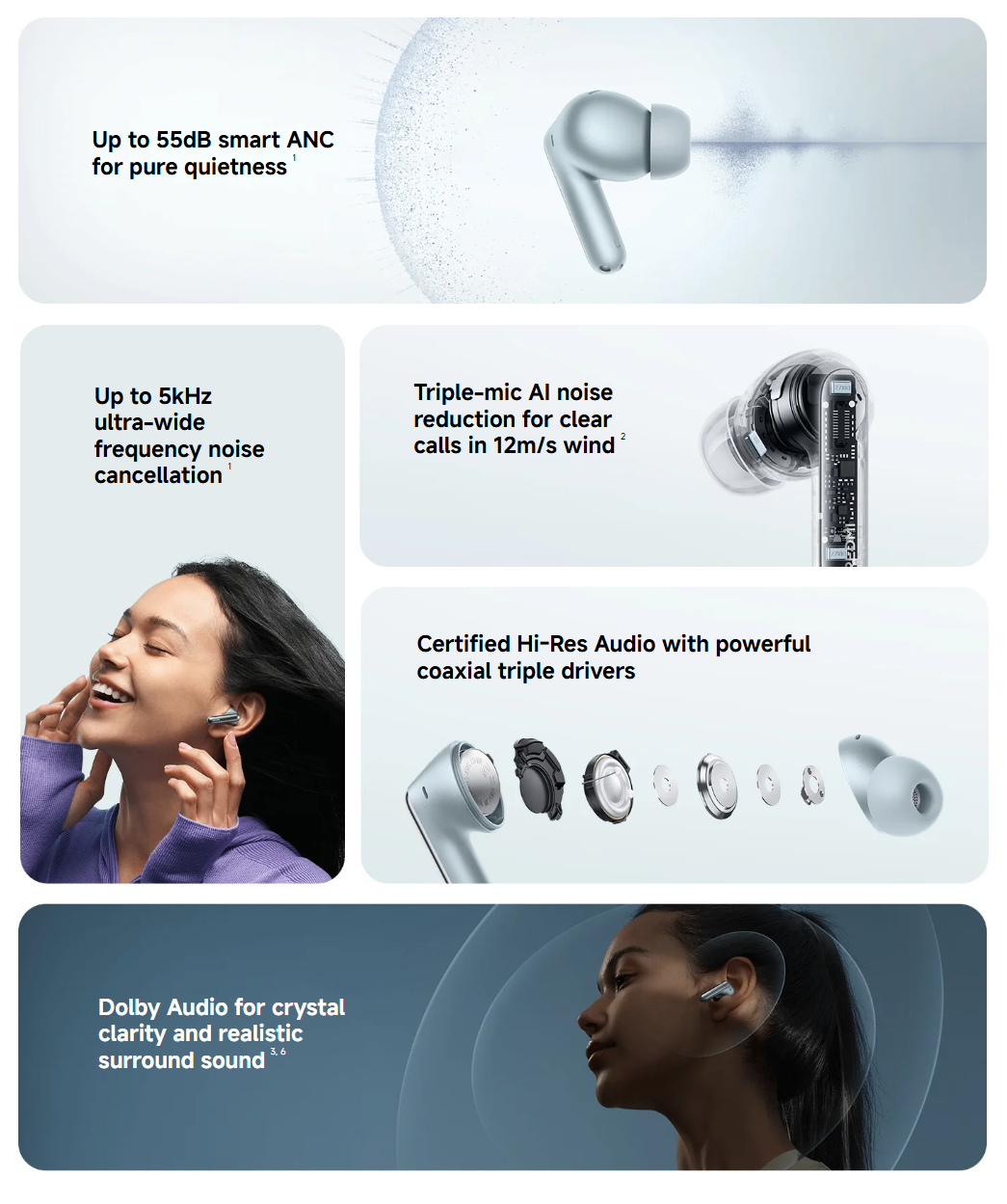 A Redmi Buds 8 Pro világszerte Cloud White, Glacier Blue és Obsidian Black színekben lesz kapható, mindegyik 54 mAh-s akkumulátorral és 480 mAh-s akkumulátorral a hozzájuk illő töltőtokban. A Xiaomi akár 8 órás üzemidőt ígér egyetlen feltöltéssel, emellett Bluetooth 5.4 képes modemet és fülhallgatónként három mikrofont telepít, amelyek segítségével akár 55 dB aktív zajszűrést (ANC) is biztosítanak.