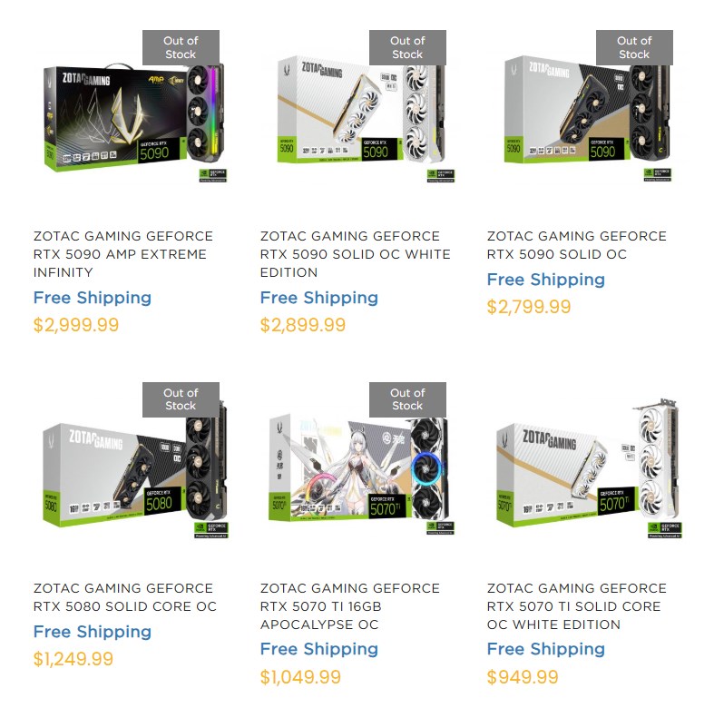 Nem sokkal a törlések után azonban a ZOTAC újra listázta a GPU-kat, jelentősen magasabb árakkal. A jelentések szerint a vállalat megemelte az árakat az összes RTX 5090 termékcsaládot több száz dollárral. Egyes modellek ára a jelentések szerint 2.299 dollár körüli összegről 2.799 dollárra, 2.399 dollárról 2.899 dollárra, illetve 2.449 dollárról közel 2.999 dollárra ugrott. A RTX 5080 még körülbelül 250 dollárral is megugrott.