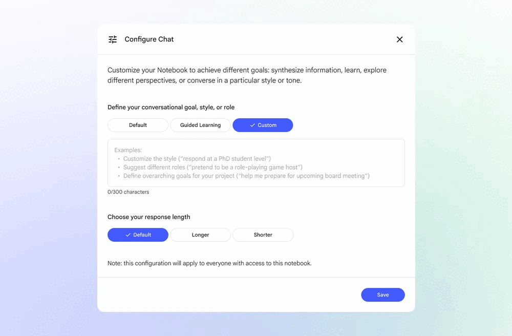 Emellett mostantól lehetőség van a chat személyre szabására, azaz arra, ahogyan a mesterséges intelligencia válaszol. A felhasználók például beállíthatnak egy "átfogó célt" az egész jegyzetfüzet számára. Ez hasznos lehet egy vizsgához szükséges tartalom megtanulásakor, egy eligazításra való felkészülésnél vagy általában egy adott témáról való tájékozódásnál. A válaszok stílusa és szintje mostantól szintén testre szabható.