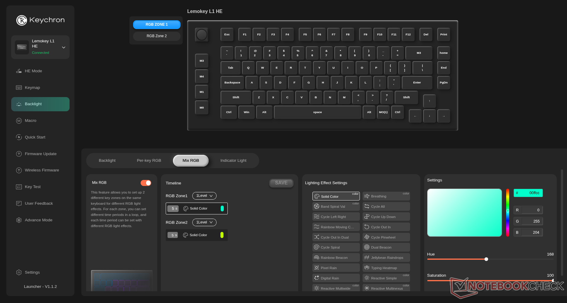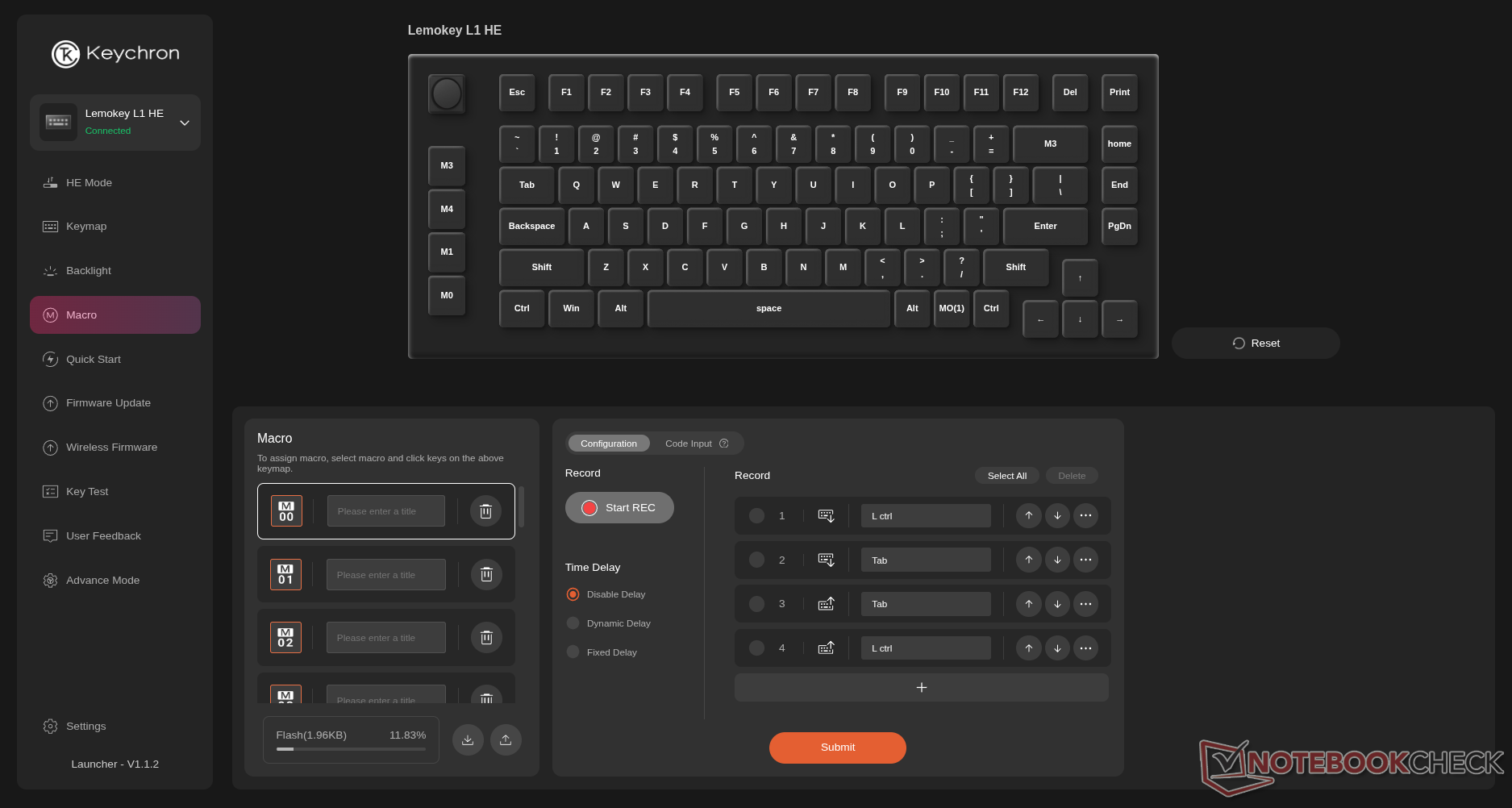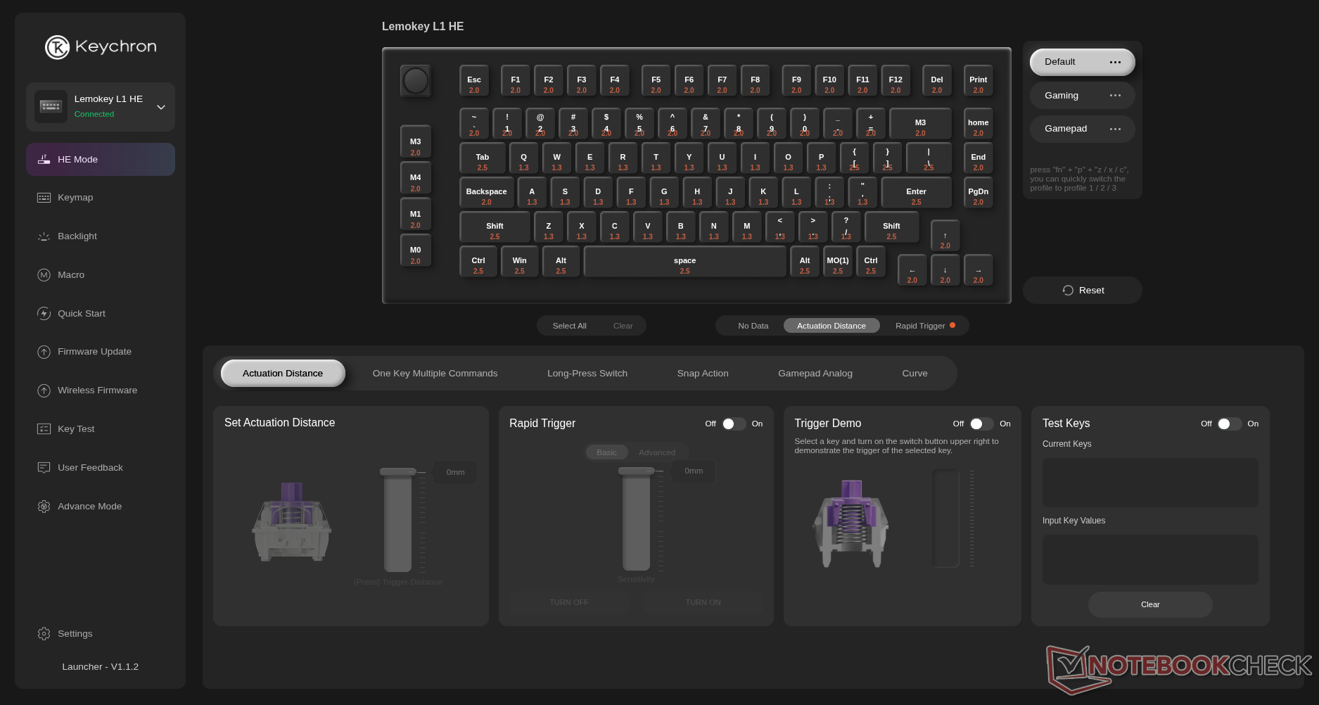 A testreszabás a Keychron vagy a Lemokey Launcher segítségével - a két webes vezérlő funkcionalitásában és elrendezésében megegyezik - kiváló, valódi billentyűkönkénti RGB testreszabással, makró testreszabással és az összes olyan csodás Hall-effektus funkcióval, amelyet a Keychron játékbillentyűzetektől elvárhatunk - kioldási távolság, snap tap, DKS, gyorskioldás és még analóg mód is a kontroller emulációhoz. Szokás szerint a Keychron egyike azon kevés márkáknak, amelyek az utóbbit kínálják a következőkön kívül Wooting. Érdekes módon a felülvizsgálati egységünkben volt egy hiba, amely azt eredményezte, hogy a Launcher kijelzőn a billentyűk nem tükrözték az RGB háttérvilágítási beállításokat, amelyek helyesen voltak megjelenítve a billentyűzeten. Ez valószínűleg a mi készülékünkkel kapcsolatos probléma vagy egy firmware hiba, amelyet kezelni fognak. Akárhogy is, elég könnyű volt megoldani, ha csak a billentyűzetet nézzük a beállítások alkalmazásakor.