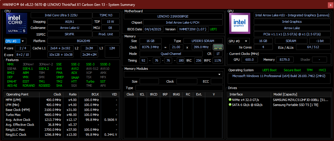 | Lenovo ThinkPad X1 Carbon Gen 13 21NX008PGE Intel Core Ultra 5 225U ⎘ Intel Graphics 4-Core iGPU (Arrow Lake) ⎘ 16 GB Memória, 512 GB SSD | Amazon: $1,649.99 List Price: 1955 Euro | 1.2 kg | 17.5 mm | 14.00" 1920x1200 162 PPI IPS LED | |