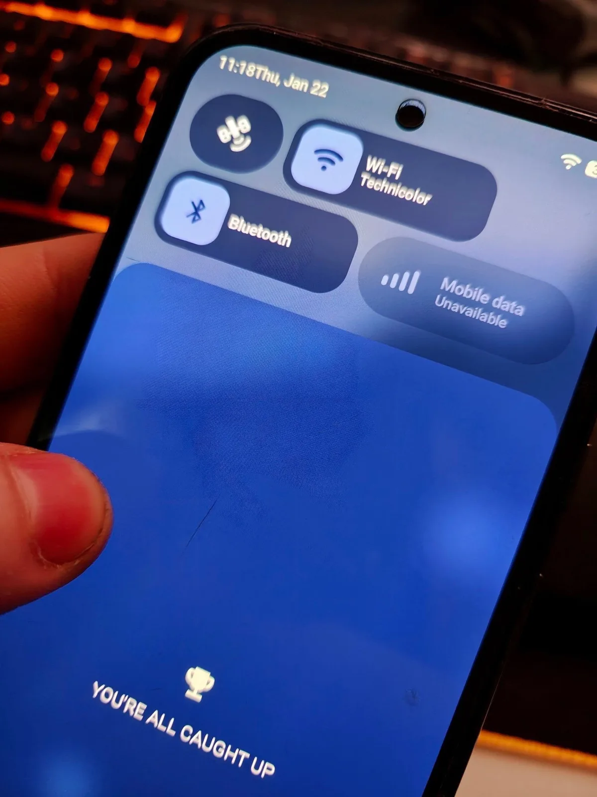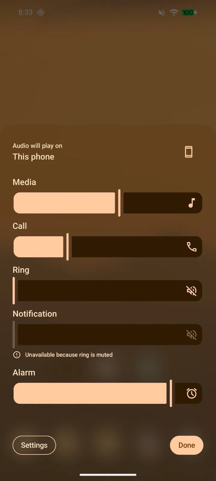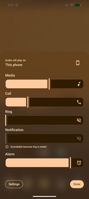 Ez az új tervezési megközelítés például a hangerőpanelen jól észrevehető. Az eddigi egyszínű háttér helyett a háttér most enyhén átlátszó, mivel a mögötte lévő elemek sokkal erősebben elmosódnak, mint a Apple készülékeken, az olvashatóság javítása érdekében. A Google ezeket az átlátszó területeket a felhasználó által kiválasztott akcentusszínnel színezi.