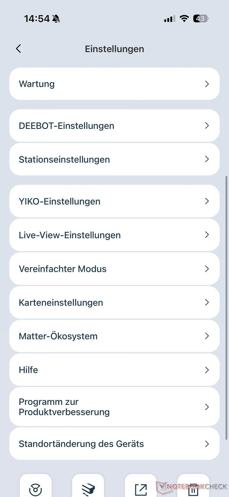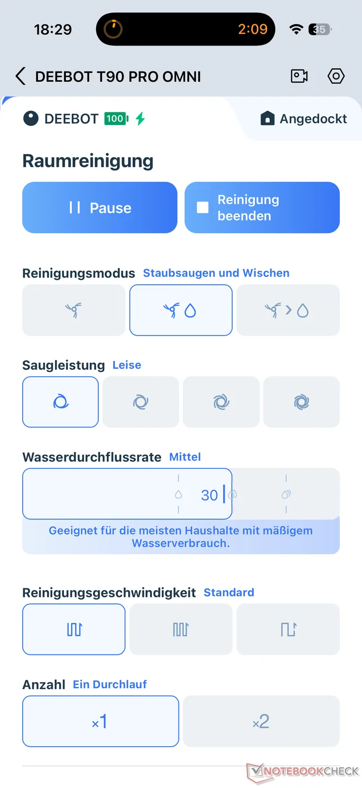 A munka előrehaladása élőben nyomon követhető a készülékbejegyzés áttekintésében. A zóna- és teljes tisztítás alternatívájaként egyes helyiségek tisztításához ezeket a térképen kell kiválasztani. A menüben számos beállítási lehetőség áll rendelkezésre. Élő videóközvetítés és az Ecovacs saját hangasszisztense, a Yiko is rendelkezésre áll.