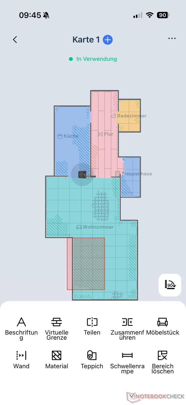 Miután a robot, az alkalmazás és a Wi-Fi hálózat közötti kapcsolat zökkenőmentesen létrejött a teszt során, következik a kötelező feltérképezési futtatás. Tesztkörnyezetünkben az itt létrehozott virtuális térkép a helyiségfelismerés tekintetében nem volt egészen egyenrangú néhány más modellel. Ez azonban a térképkezeléssel néhány perc alatt beállítható volt. Az összes szokásos funkció, mint például a korlátozott zónák, küszöbök, padlóanyag és bútorok rendelkezésre állnak.
