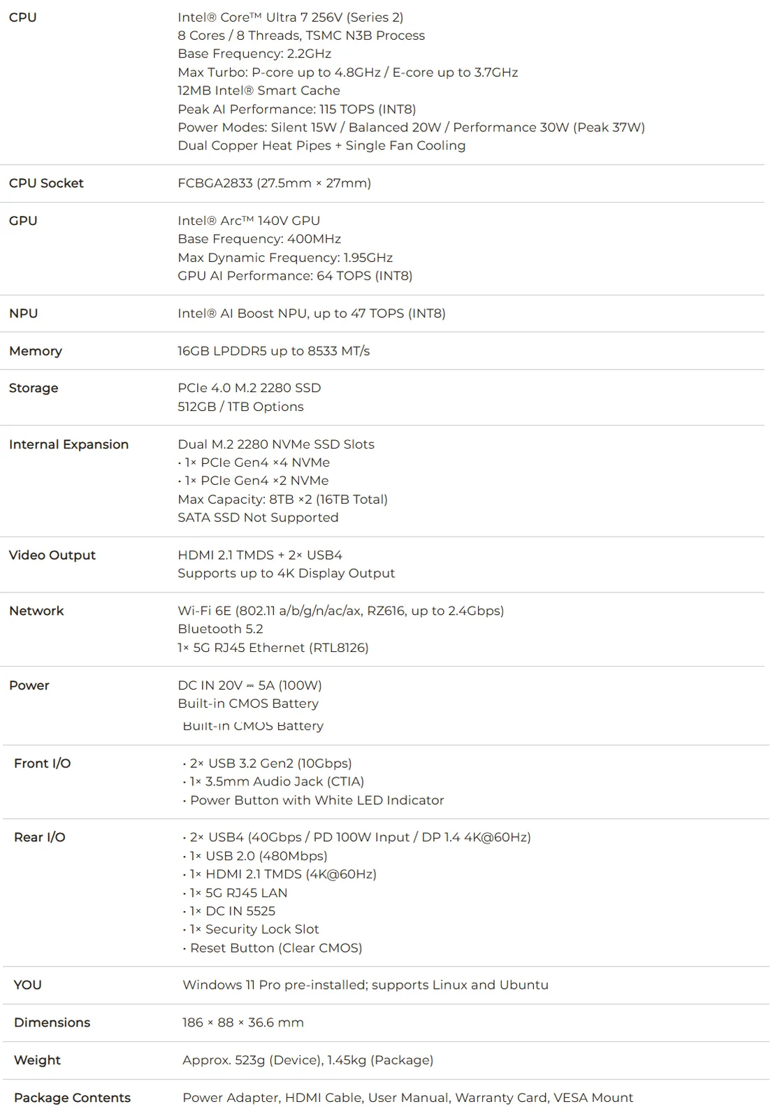A motorháztető alatt ez a kis mini PC az Intel Core Ultra 7 256V-t, a Lunar Lake termékcsalád felső középkategóriás processzorát rejti. Jellemzői az Arc 140V iGPU, amely a vizuális beállítások finomhangolásával simán kezeli a modern játékok jó részét 1080p felbontáson.