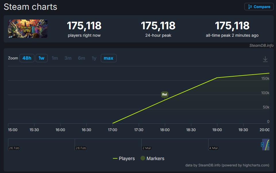 A SteamDB adatai szerint a játék már néhány órával a megjelenés után több mint 175 000 egyidejű játékost ért el a Steamen. Ez nagyon erős kezdés, különösen egy korai hozzáférésű címtől. Összehasonlításképpen: az eredeti Slay the Spire körülbelül három hónappal ezelőtt érte el az 57 025 játékosos csúcsot. Ez azt jelenti, hogy a folytatás a megjelenést követő néhány órán belül máris majdnem háromszorosan meghaladta elődje csúcsát.