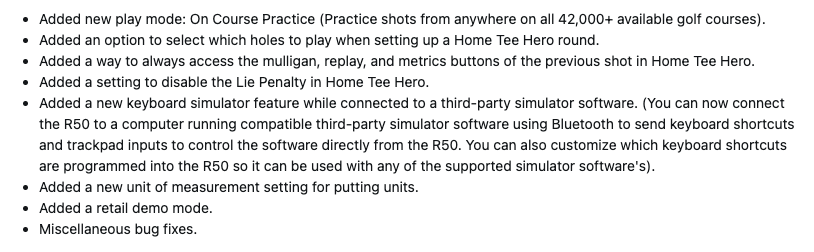 A 4.80-as szoftververzióval az Approach R50 felhasználói számos új funkciót kapnak. Van egy új játékmód, az On Course Practice, amely lehetővé teszi a különböző ütések kipróbálását több mint 42 000 golfpályán. A felhasználók mostantól kiválaszthatják, hogy melyik lyukat játsszák a Home Tee Hero kör során, és ebben az üzemmódban kikapcsolható a Lie Penalty. Emellett a felhasználók mostantól a Home Tee Hero-ban elérhetik az előző ütés mulligan, replay és metrika gombjait.