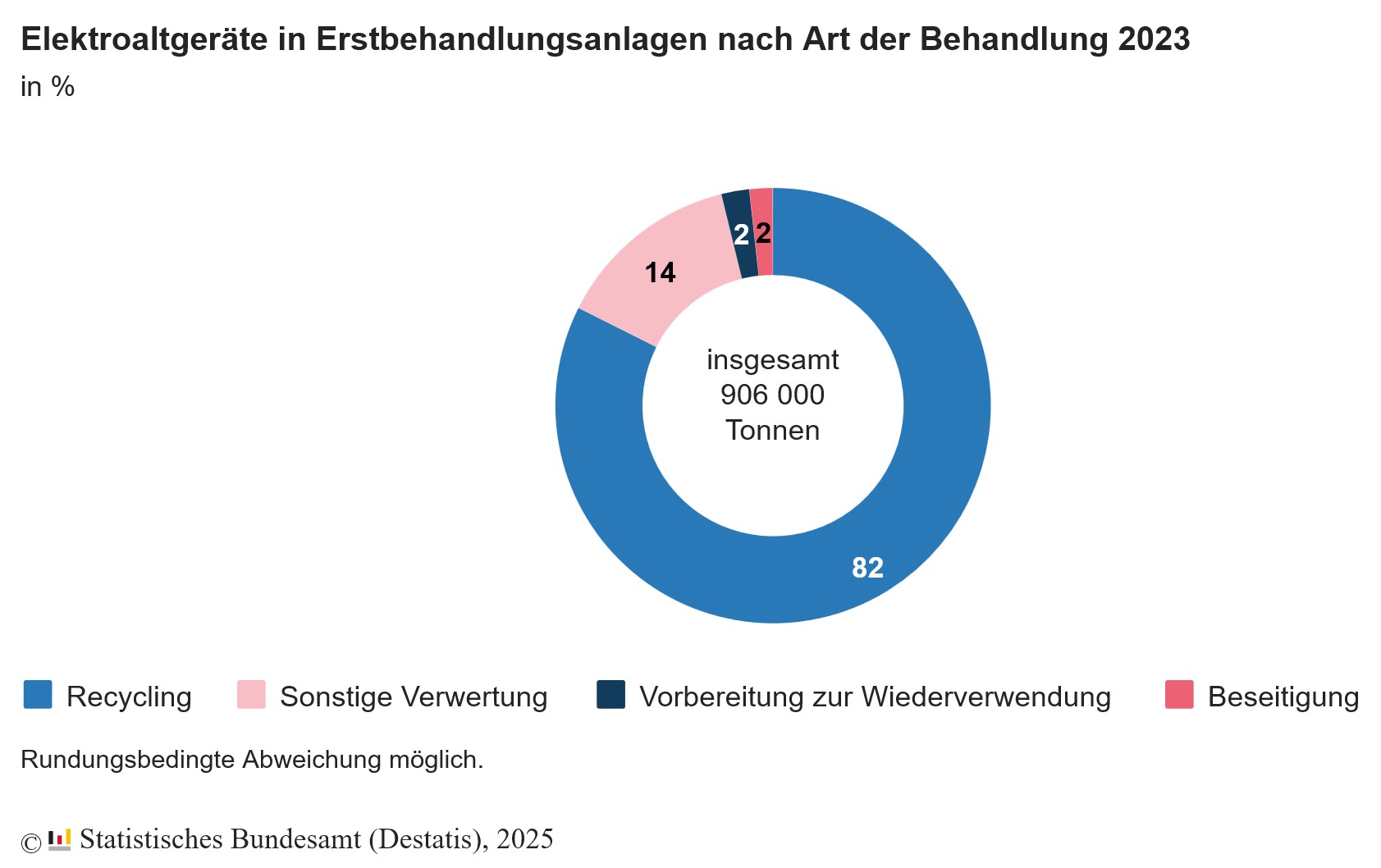 Az elektronikai hulladékok újrahasznosítása Németországban továbbra is rendkívül fontos kérdés a nyersanyag-átalakítás szempontjából. A német szövetségi statisztikai hivatal (Destatis) adatai szerint 2023-ban 906 100 tonna elektronikus hulladékot dolgoztak fel tanúsított elsődleges kezelő létesítményekben. Ebből 747 000 tonna került újrahasznosításra, ami 82,4%-os újrahasznosítási aránynak felel meg.