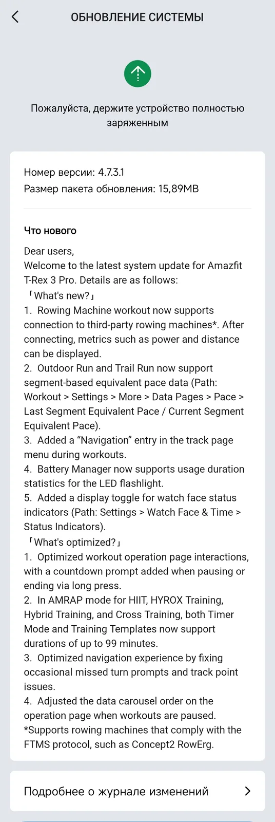 A 4.7.3.1 firmware verzióval a T-Rex 3 Pro felhasználók mostantól egy FTMS-kompatibilis harmadik féltől származó evezőgépet is csatlakoztathatnak az okosórához, hogy az evezőgépes edzések során teljesítmény- és távolságméréseket gyűjtsenek. A szabadtéri futás és a Trail Run tevékenységek esetében mostantól szegmensenként is megtekintheti az egyenértékű tempóadatokat. Az edzés közbeni pályaoldal menüjében új Navigáció rész található. Emellett az Amazfit okosóra akkumulátor-kezelője mostantól képes a viselhető beépített LED-es zseblámpához kapcsolódó adatokat megjeleníteni.