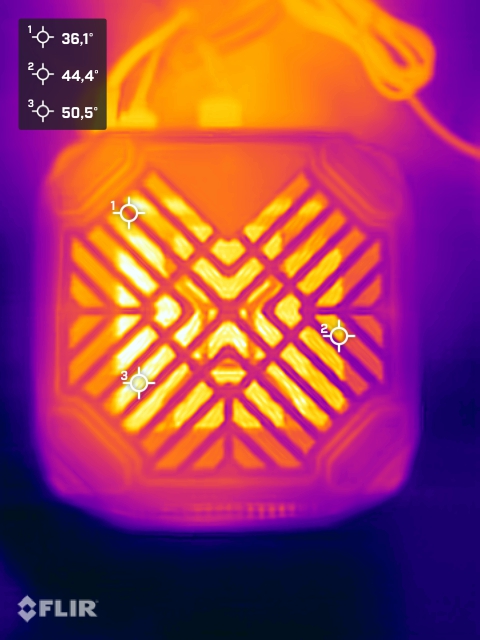 Terhelés alatt az Acemagic M1A Pro+ készülékháza csak mérsékelten melegszik. A hűtési kialakításnak köszönhetően a hátsó rész érezhetően felmelegszik, melegebb, mint az összes többi oldal, bár itt nem alakulnak ki extrém forró pontok. Maga a processzor csak rövid időre melegszik 90 °C fölé, amikor az akár 140 wattos energiafogyasztást alkalmazzuk. Az APU hőmérséklete ezután 79 °C körül stabilizálódik.