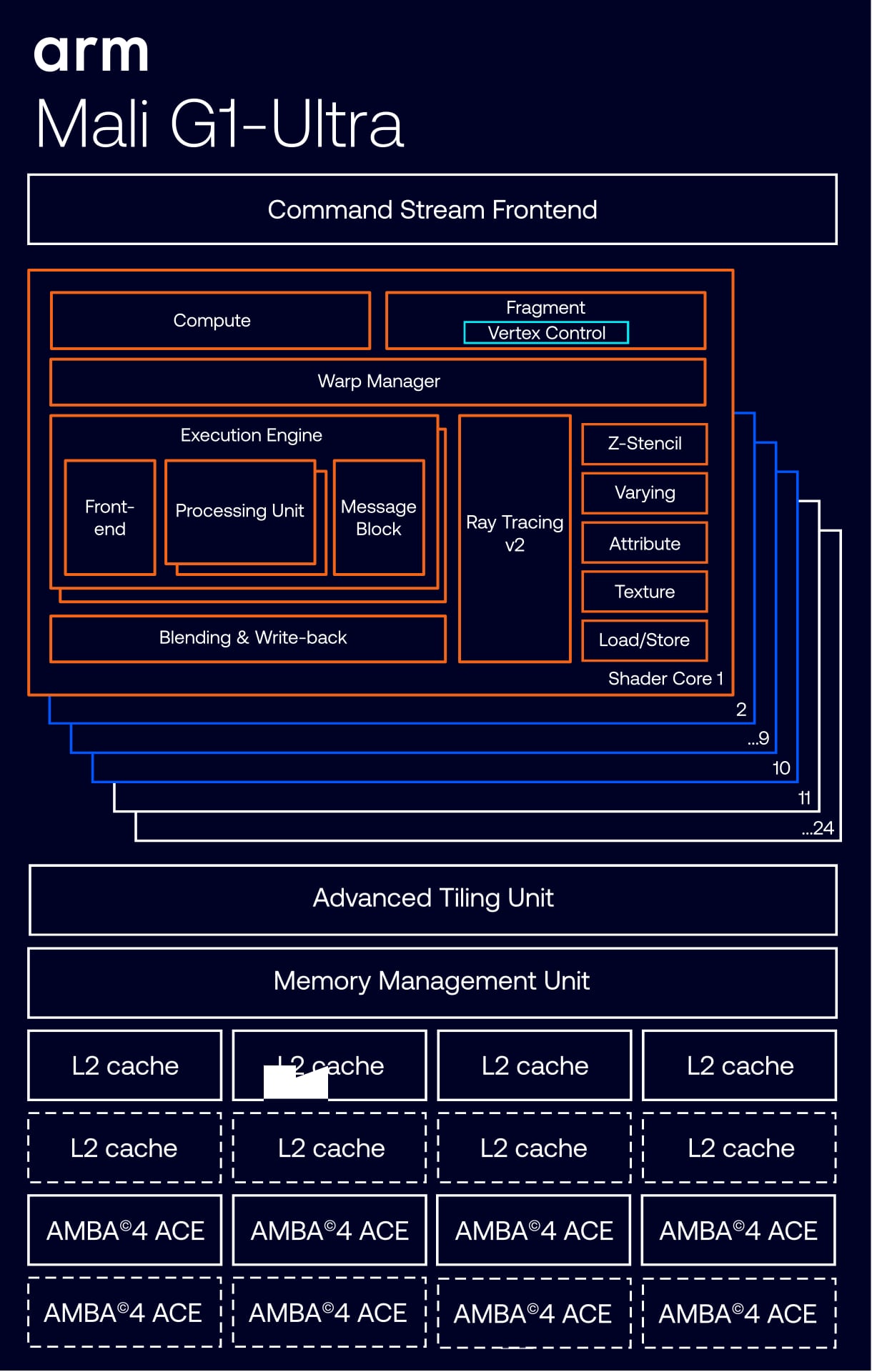 | Jellegzetességek | OpenGL ES 3.2, OpenCL 2.0 FP, Vulkan 1.2, ASTC, AFBC |