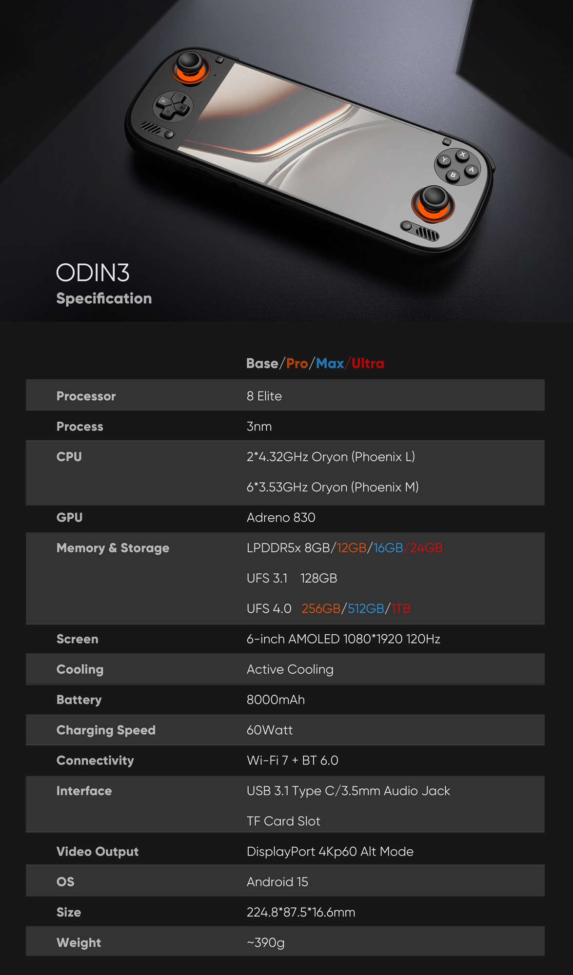A kontextus kedvéért, a Pocket 5 kiskereskedelmi ára 219 dollár Qualcomm Snapdragon 865 lapkakészlettel, 5000 mAh-s akkumulátorral és 5,5 hüvelykes AMOLED-kijelzővel 60 Hz-en. A kéziszámítógép továbbá csak 8 GB LPDDR4x RAM-mal és 128 GB UFS 3.1 flash-tárolóval konfigurálható. Eközben az Odin 3 az alábbi hardverrel rendelkezik minden SKU-nál: