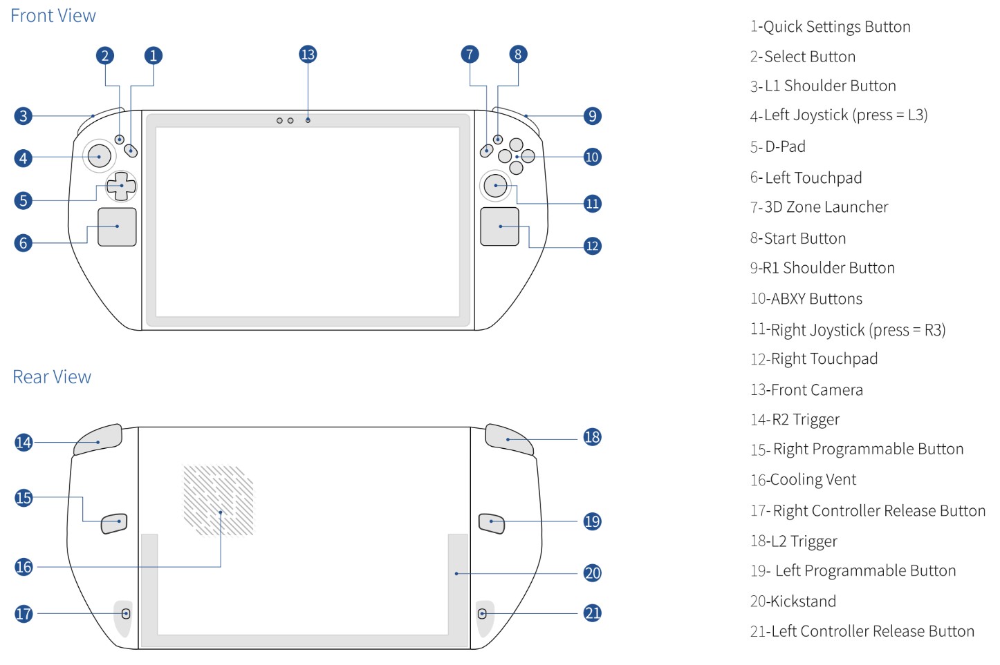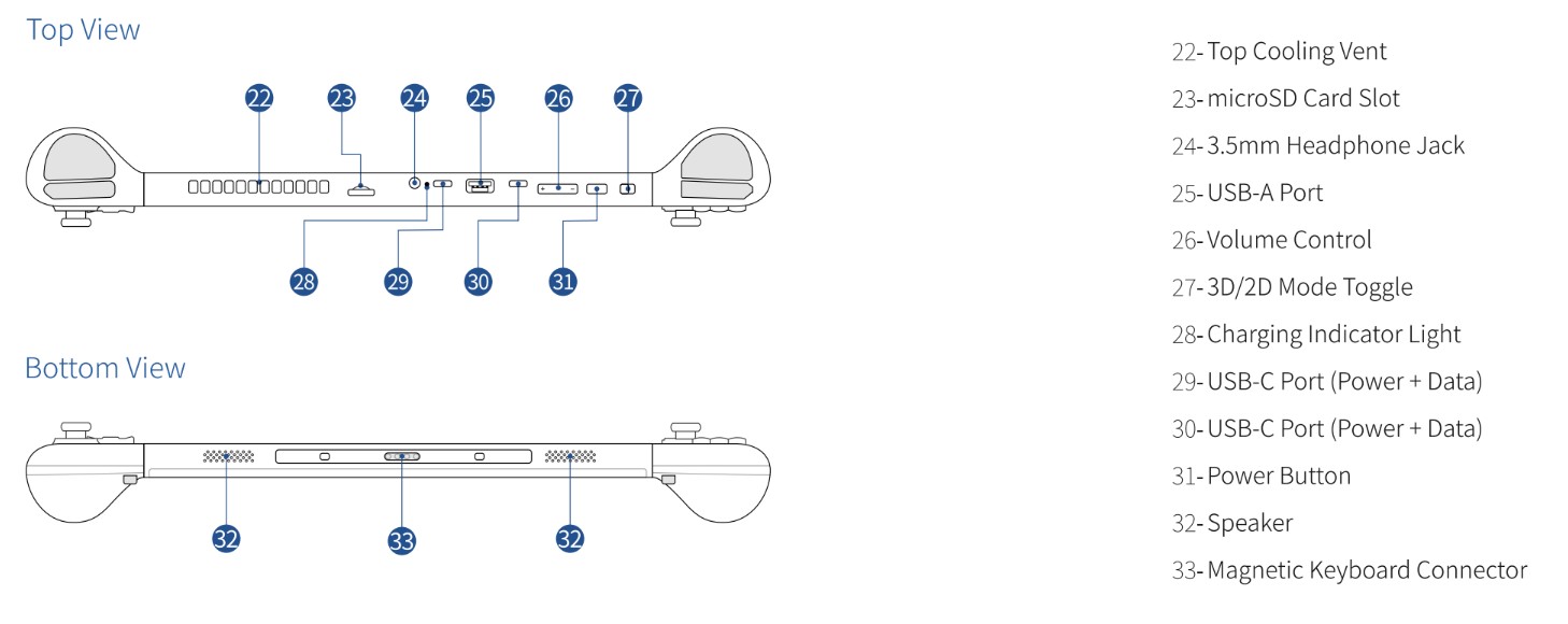 Súlya 0,87 kg (1,92 font), ami hasonló a Surface Pro 10 0,885 kg-os súlyához. A Hall Effect joystickkel ellátott, teljes méretű játékvezérlők csatlakoztatva további 0,24 kg-ot (0,53 fontot) adnak hozzá. A Surface Pro-hoz hasonlóan opcionális billentyűzet és állvány is megvásárolható, így a 3D One 2 az 1-ben laptopként is használható.