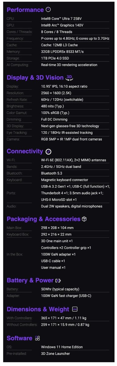 A 3D One a parallaxis gát módszerét használja a valódi, szemüveg nélküli 3D képek előállításához a 10,95 hüvelykes, 2560 x 1600, 120 Hz-es LCD érintőképernyőn, amely 480 nits maximális fényerővel rendelkezik. A 3D üzemmód bekapcsolásakor a 3D One egy 180 Hz-es AI szemkövető kamerát használ a 3D hatás megfelelő megjelenítéséhez a sztereoszkópikus képernyőn.